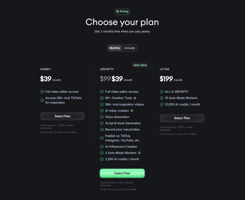 • Free Plan – Up to 3 videos/month, watermark included.